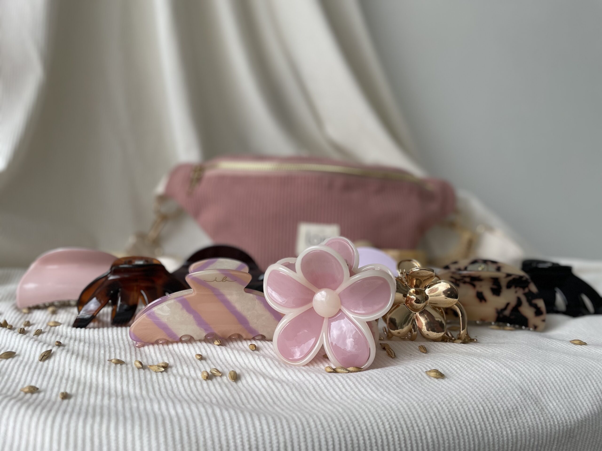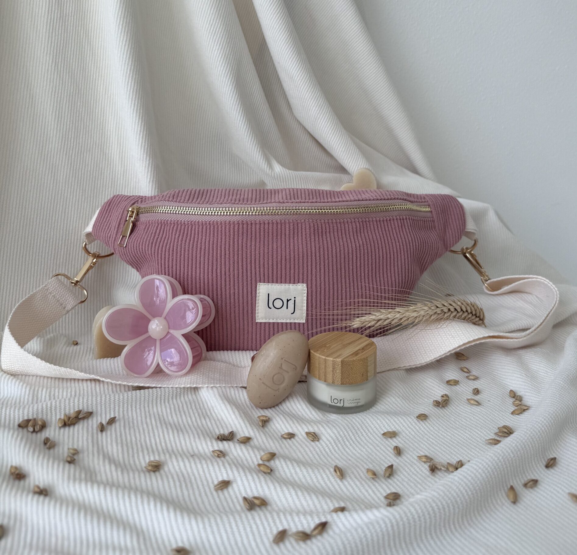 Une routine beauté naturelle et nomade avec une banane en velours côtelé, une mini crème visage à l’élixir d'orge germée, un mini savon visage & corps et une pince à cheveux surprise.